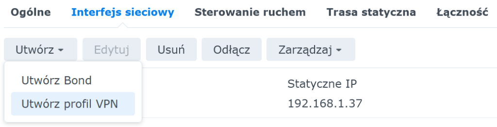 Początek jest zgodny ze „standardowymi poradnikami” dla Synology DSM. Wchodzimy kolejno do Panel sterowania → Sieć → Interfejs sieciowy → Utwórz → Utwórz profil VPN: